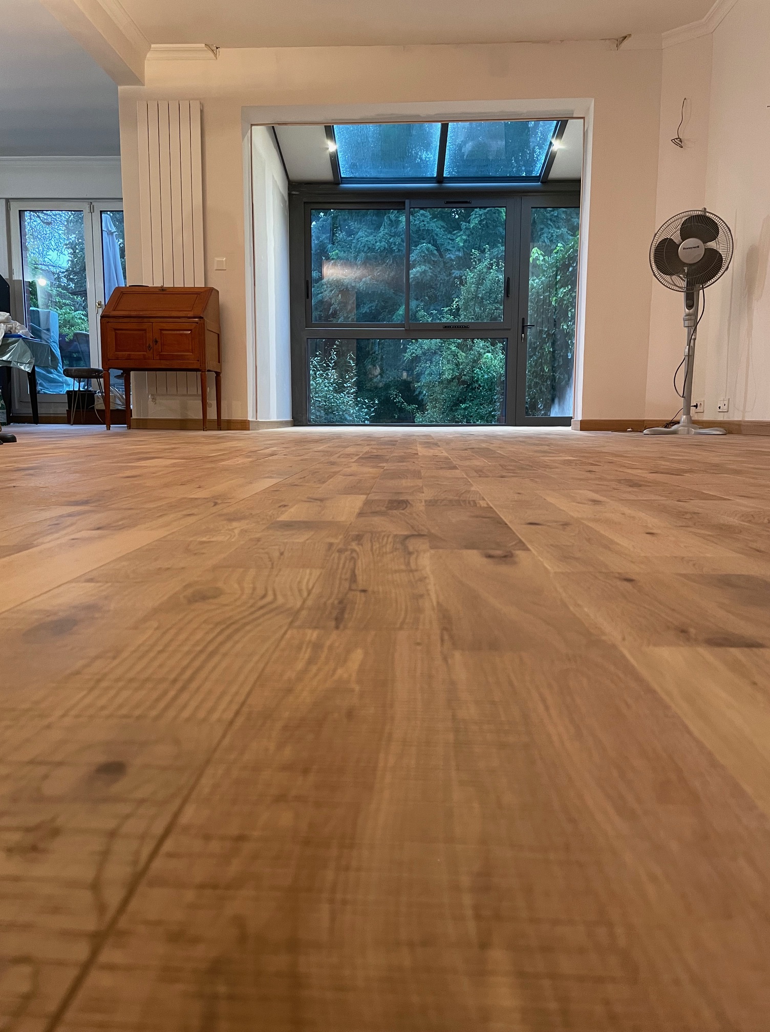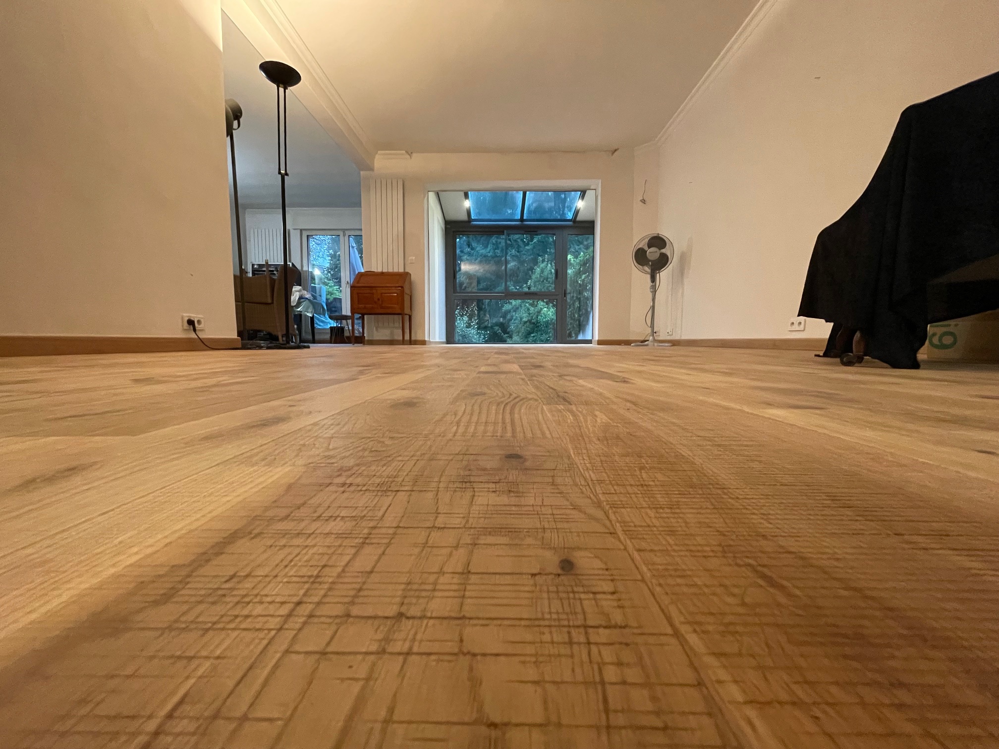 Deux belles photos d’un parquet chêne massif, 2 frises sable en largeur de 180 mm, un parquet avec un aspect scié qui lui donne un côté authentique. Il s’agit d’un parquet déjà huilé et donc prêt à poser, les photos mettent bien en évidence les traits de scie laissés volontairement en surface du parquet